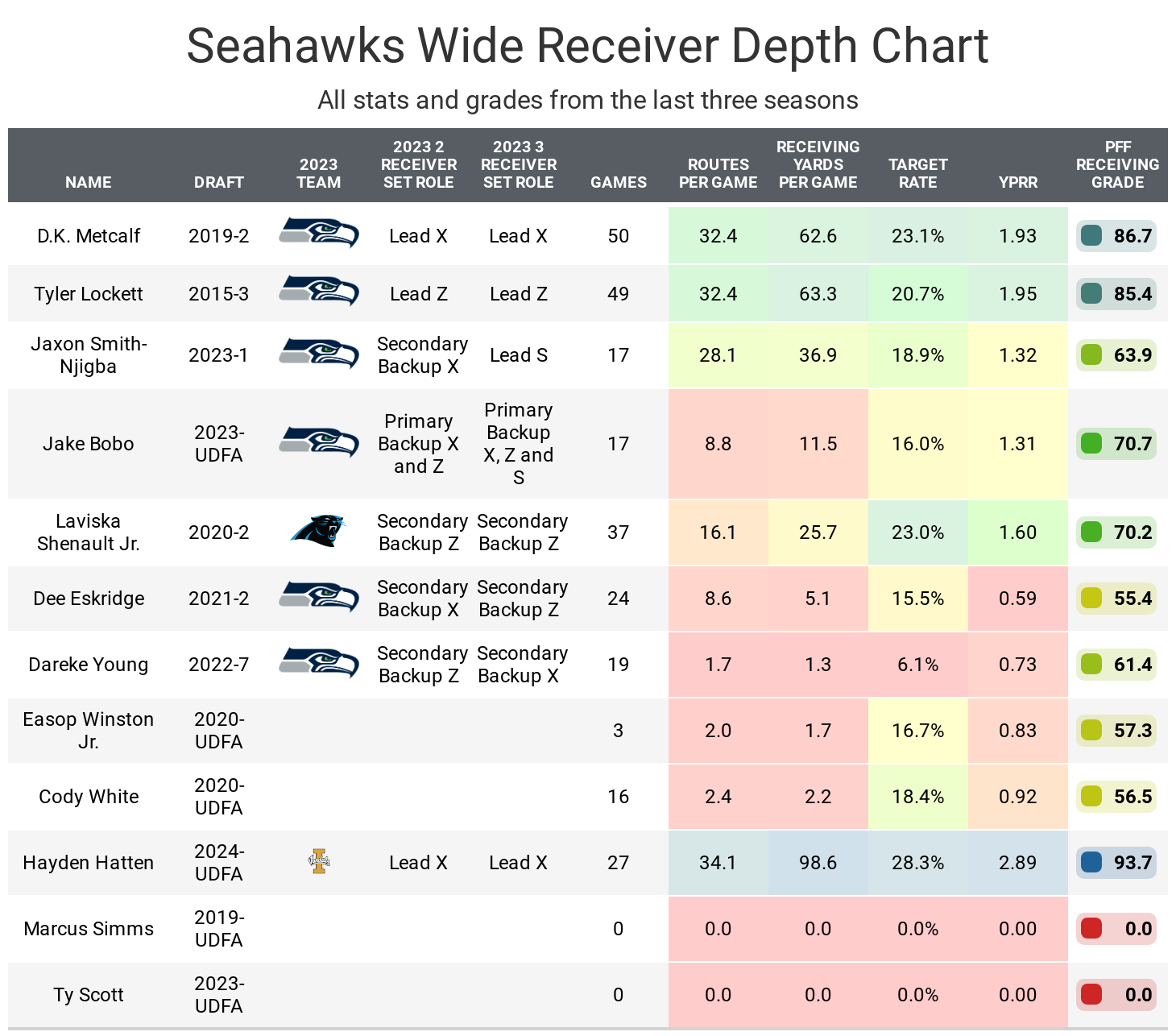 D.K. Metcalf and Tyler Lockett were firmly established as the two starting receivers, playing over 80% of snaps in two-receiver sets. Jake Bobo typically stood in when either Metcalf or Lockett was off the field. Smith-Njigba played only 22 snaps in two-receiver sets, 10 were run plays.