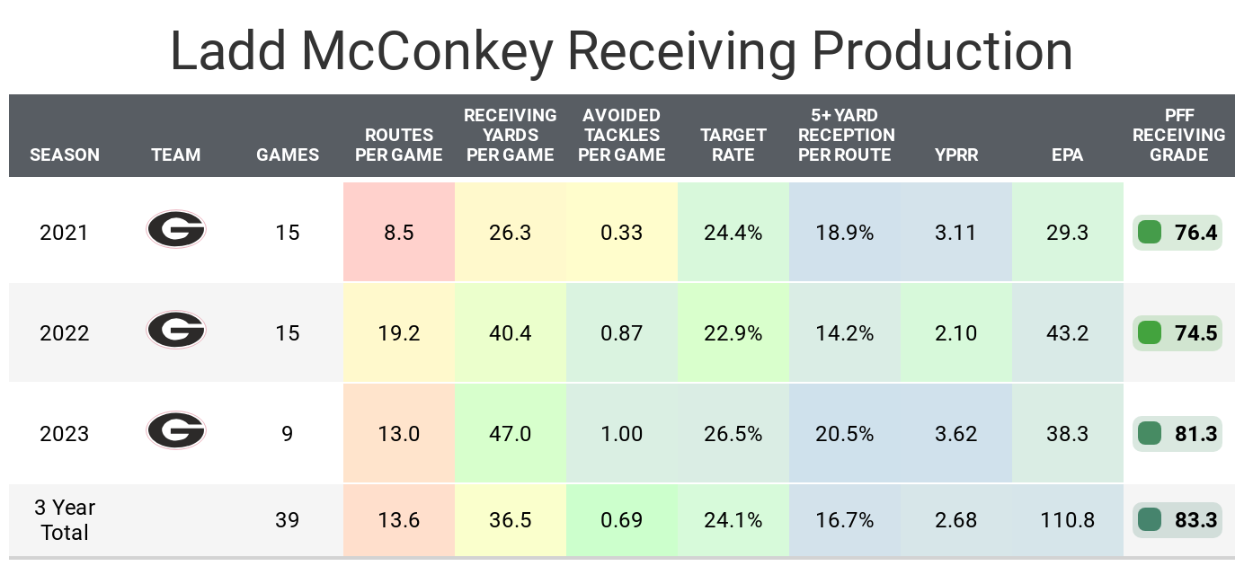 He primarily played out wide with Georgia but performed better lined up in the slot against zone coverage. It’s worth noting McConkey didn’t play the first few weeks of his final college season, so all of his stats in 2023 were up against SEC competition or in his Bowl game, rather than having his stats padded against other non-conference games.