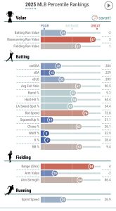 The speed output also comes with warning labels. Fourteen steals look helpful, but getting caught seven times is not. Even with above-average sprint speed, a 67% success rate won’t earn unlimited green lights. That category could quietly slide from “helpful” to “neutral” in a hurry. Then there’s the underlying quality of contact. A 24th-percentile hard-hit rate, 33rd-percentile squared-up rate, and 45th-percentile barrel rate paint the picture of a player who got to 27 homers more through volume and environment than thunderous contact. Pair that with a chase rate five points worse than league average and a modest walk rate, and the plate discipline profile offers little cushion. He does elevate the ball consistently, but with that approach, the .272 average feels closer to a peak than a baseline. A drift into the .250 range is far more realistic.