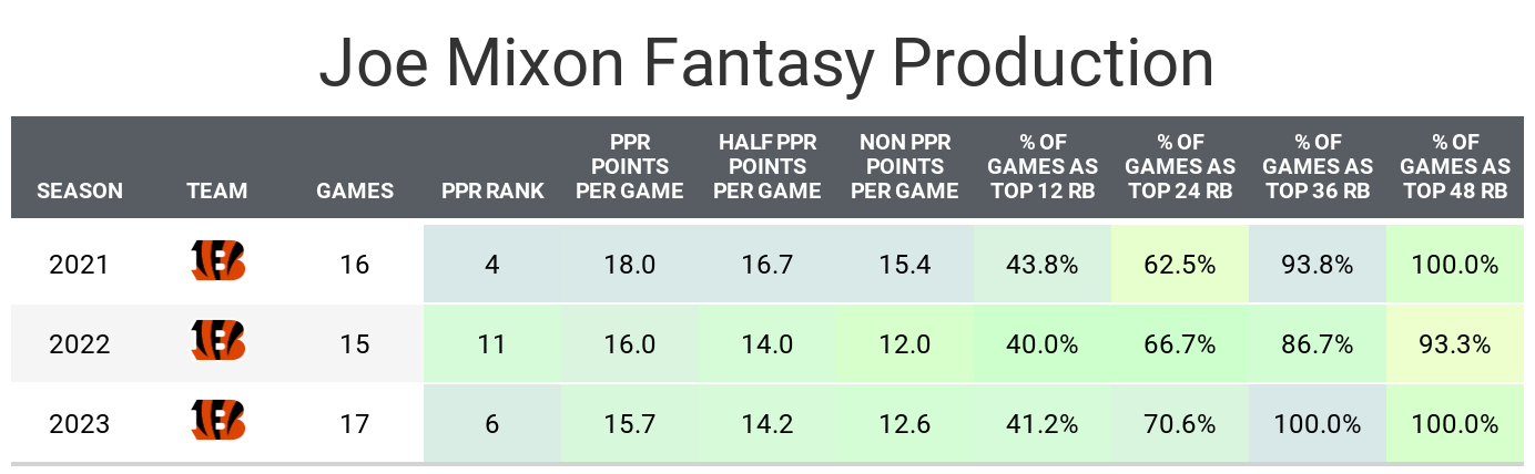Mixon has been a consistent top-12 fantasy running back in both total ranking and points per game. Although he enters a new environment in 2024, he will again play in a high-scoring offense as the Houston Texans‘ clear lead running back. While he’s never been the most explosive running back, it’s fair to think he will finish in the top 12 yet again. Offensive coordinator Bobby Slowik recently said Mixon is “an absolute workhorse, in every regard.” The offenses Slowik has been part of generally run the ball more than average, which should continue to be true with Mixon.