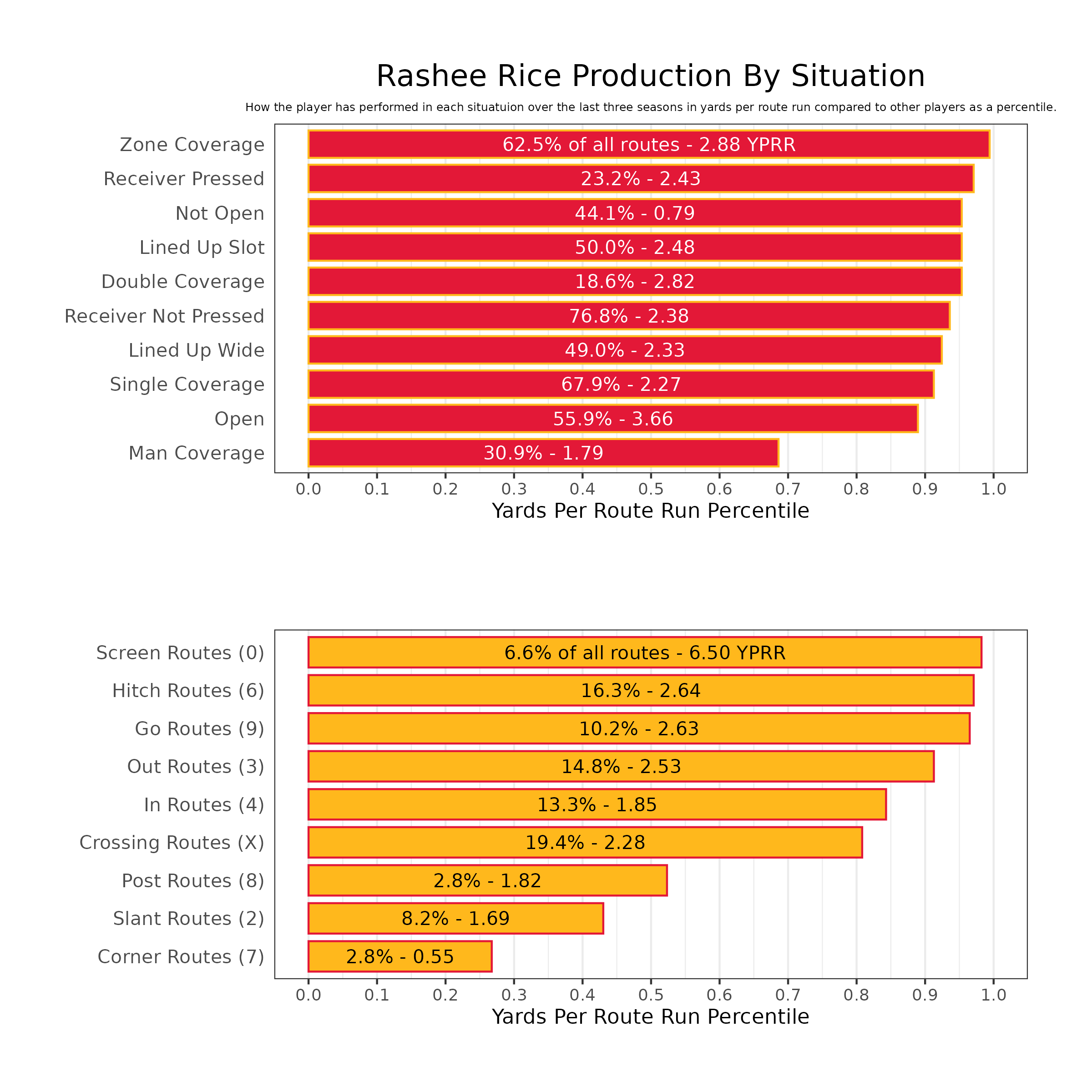 Rice finished as WR27 and was a top-36 wide receiver in nearly 70% of his games despite playing less than 70% of his team’s offensive snaps in all but four games. By Week 14, he began receiving playing time comparable to a typical starting wide receiver, playing at least 75% of his team’s offensive snaps from Weeks 14-17. During this period, he ranked eighth in fantasy points among wide receivers. In the playoffs, Rice played at least 75% of the Kansas City Chiefs‘ offensive snaps in three of four games, averaging 6.5 receptions for 65.5 yards per game against some of the NFL’s best defenses.