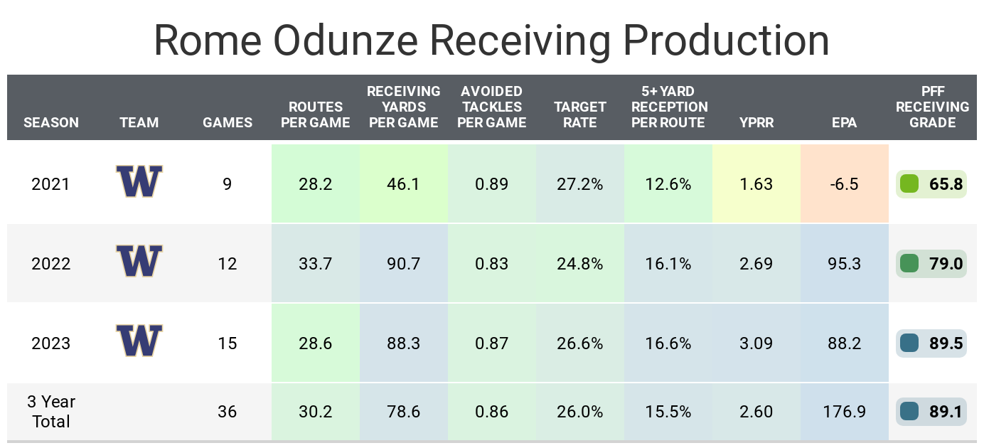 Our draft guide calls him a super-sized Chris Olave, and he is the best contested-catch receiver in the class. Over the last two seasons, no wide receiver in college football had more deep targets or deep receiving yards. His 1,639 receiving yards were the most by a Power Five wide receiver last season. His 88.8 PFF receiving grade when lined up out wide was the highest among all Power Five receivers. The concern is he’s the third option in Chicago, but he’s already taken a snap over Keenan Allen in 12 personnel in the preseason. It wouldn’t be surprising if he becomes the every down receiver over Allen at some point this season. The San Francisco 49ers last season and Miami Dolphins and Philadelphia Eagles the year before showed a good team can maintain two top-15 fantasy wide receivers, making Odunze’s ceiling sky-high.