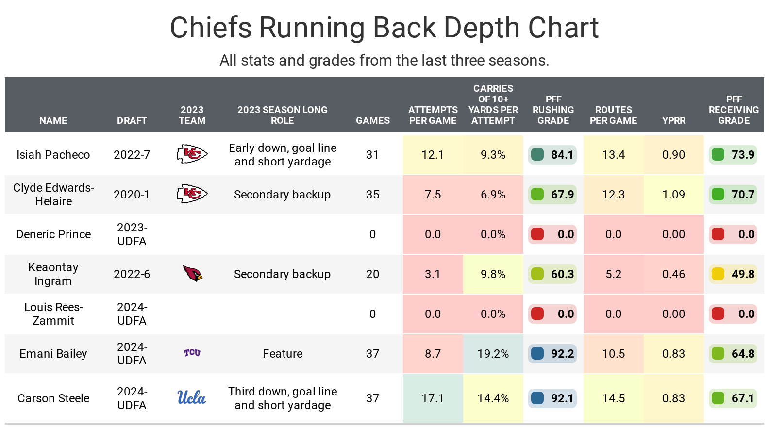 Pacheco’s biggest reason for optimism is the Kansas City Chiefs didn’t re-sign 32-year-old running back Jerick McKinnon, who had been the Chiefs’ primary third down and two-minute drill back for the last two seasons. He was also a primary backup on early downs, particularly near the goal line. Those goal-line plays helped McKinnon to 13 receiving touchdowns over the last two seasons. While Clyde Edwards-Helaire should get the majority of this work, this should give Pacheco a chance to improve on his RB15 season from a year ago.