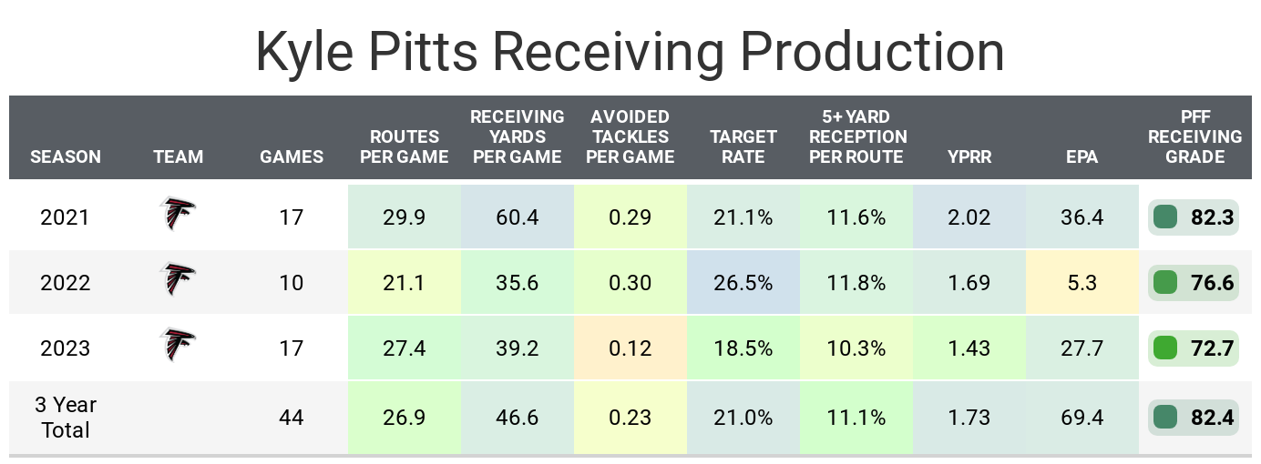 Pitts is a very talented tight end who has consistently underperformed in fantasy football. His 82.4 PFF receiving grade over the last three seasons is the fifth-best among tight ends, behind Travis Kelce, George Kittle, Mark Andrews and Dallas Goedert. Pitts’ utilization has been a major problem. Last season, he played over 75% of offensive snaps in only two games, with a median of 64%. Zac Robinson will now orchestrate the Atlanta Falcons offense, which is a big reason for optimism regarding Pitts’ role this season. He’s expected to stay on the field and see a higher target rate.